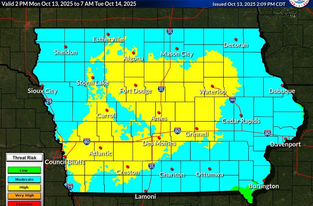 The National Weather Service says there’s a high risk of cropland fires in all or parts of over 50 Iowa counties this afternoon through sunrise tomorrow.