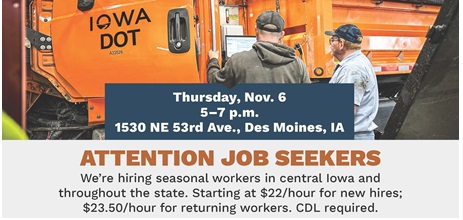 The DOT is holding an open house-style hiring event to recruit temporary snowplow drivers on Thursday from 5 to 7 PM at the agency’s Des Moines North Garage in Des Moines.