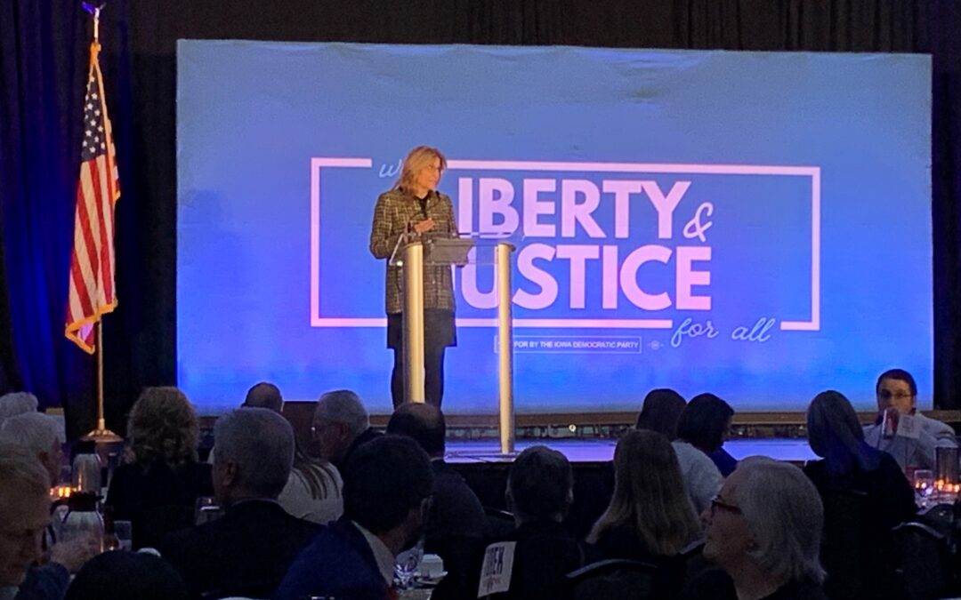 Hart also announced that after a two-year effort, the party has filled local leadership roles in about a dozen counties and it now has a chair in each of Iowa’s 99 counties. Rob Sand and Julie Stauch, Democrats who are running for governor, spoke to the crowd. Other Democratic candidates for congress and for statewide office were featured in short videos. One of the keynote speakers was to have been Mark Kelly, a U.S. Senator from Arizona, who stayed in Washington, D.C. since the senate was in session today. In a recorded video played at tonight’s event, Kelly did not mention the pending deal to end the government shutdown. His wife, former Arizona Congresswoman Gabby Giffords, did speak briefly in Des Moines and got a standing ovation from the crowd. Giffords was gravely injured in early 2011 during a shooting at a constituent event and suffered a brain injury. She has become an advocate for gun violence prevention.
