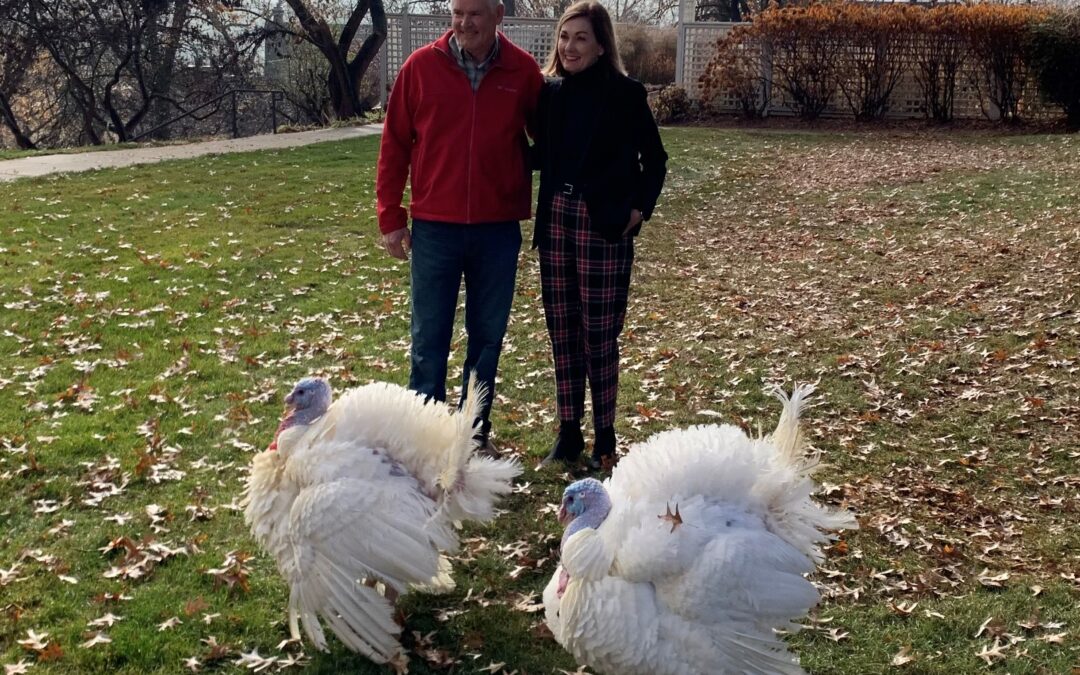 Governor Kim Reynolds hosted the event at the governor’s mansion in Des Moines as two turkeys roamed the grounds. “Today’s honored guests are Tailfeather and Wingding,” Reynolds said, as the turkeys responded with gobbles. “There you go. They love it.”