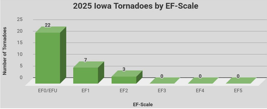 The National Weather Service’s summary for 2025 shows the number of confirmed tornadoes in Iowa was below average in 2025.